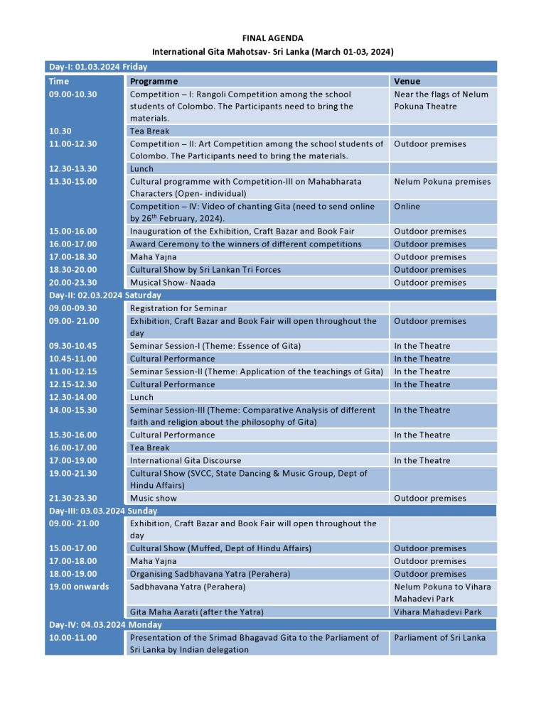 Sri Lanka, adorned with rich cultural heritage, has become the host to this magnificent event, graciously approved by the Cabinet and sponsored by the Kurukshetra Development Board from Haryana, India. Paying homage to the profound teachings encapsulated within the Bhagavad Gita, the festival promises a tapestry of religious fervor, cultural extravagance, and intellectual discourse.
