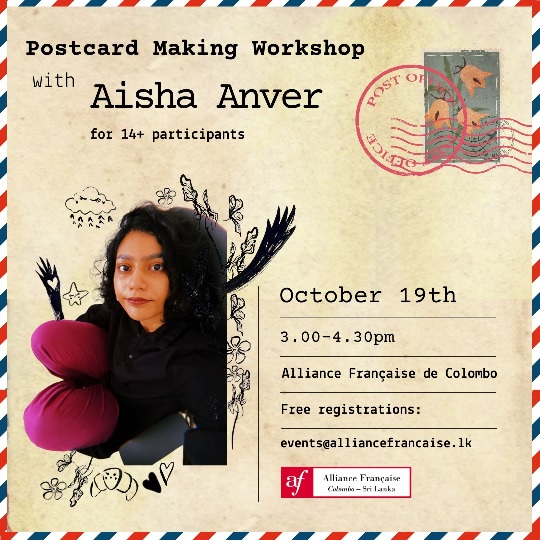 The Alliance Française de Colombo welcomes the writer and artist Aisha Anver for a postcard making workshop, reviving the nostalgic culture of postal correspondence with a focus on personalizing postcard designs.